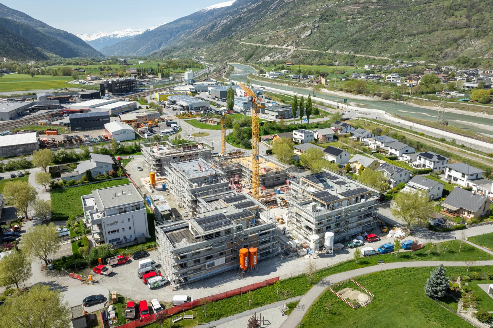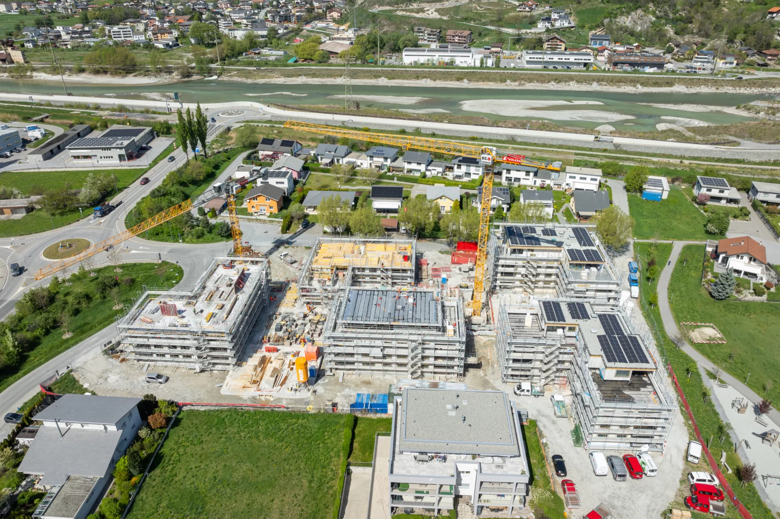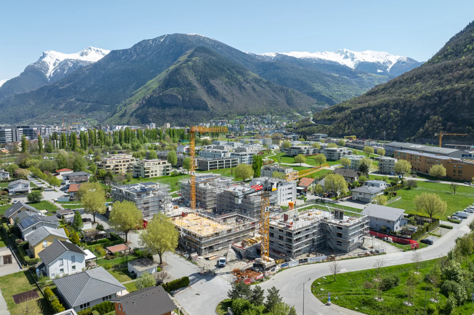 In Visp-West entstehen vier moderne Mehrfamilienhäuser mit großzügigen 3.5-, 4.5- und 5.5-Zimmerwohnungen. Die zentrale Lage bietet höchsten Wohnkomfort: Diverse Einkaufsmöglichkeiten, die Post, ein Sportplatz sowie der Bahnhof befinden sich nur wenige Gehminuten entfernt. Diese Wohnanlage vereint urbanes Leben mit einer optimalen Infrastruktur und kurzen Wegen für den täglichen Bedarf.