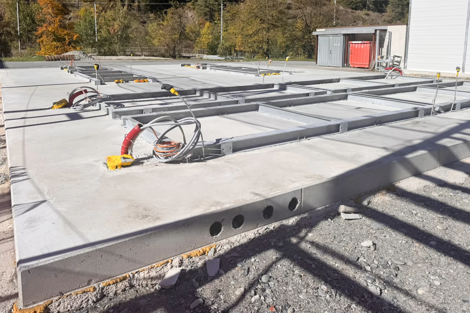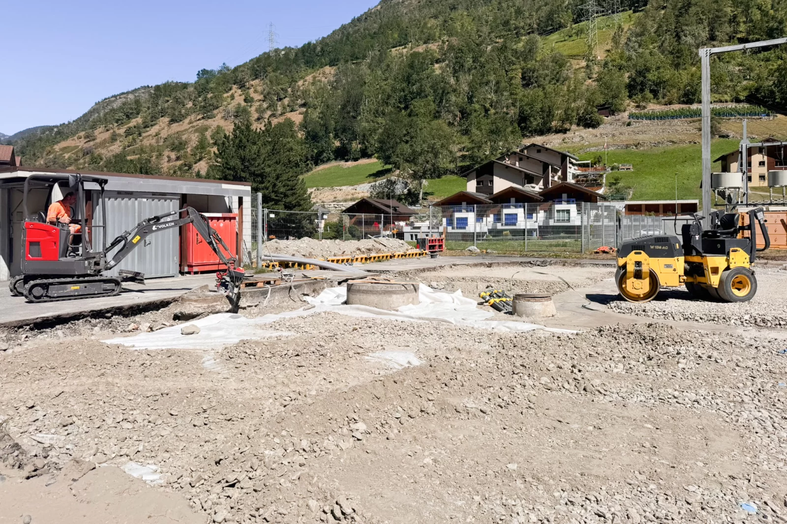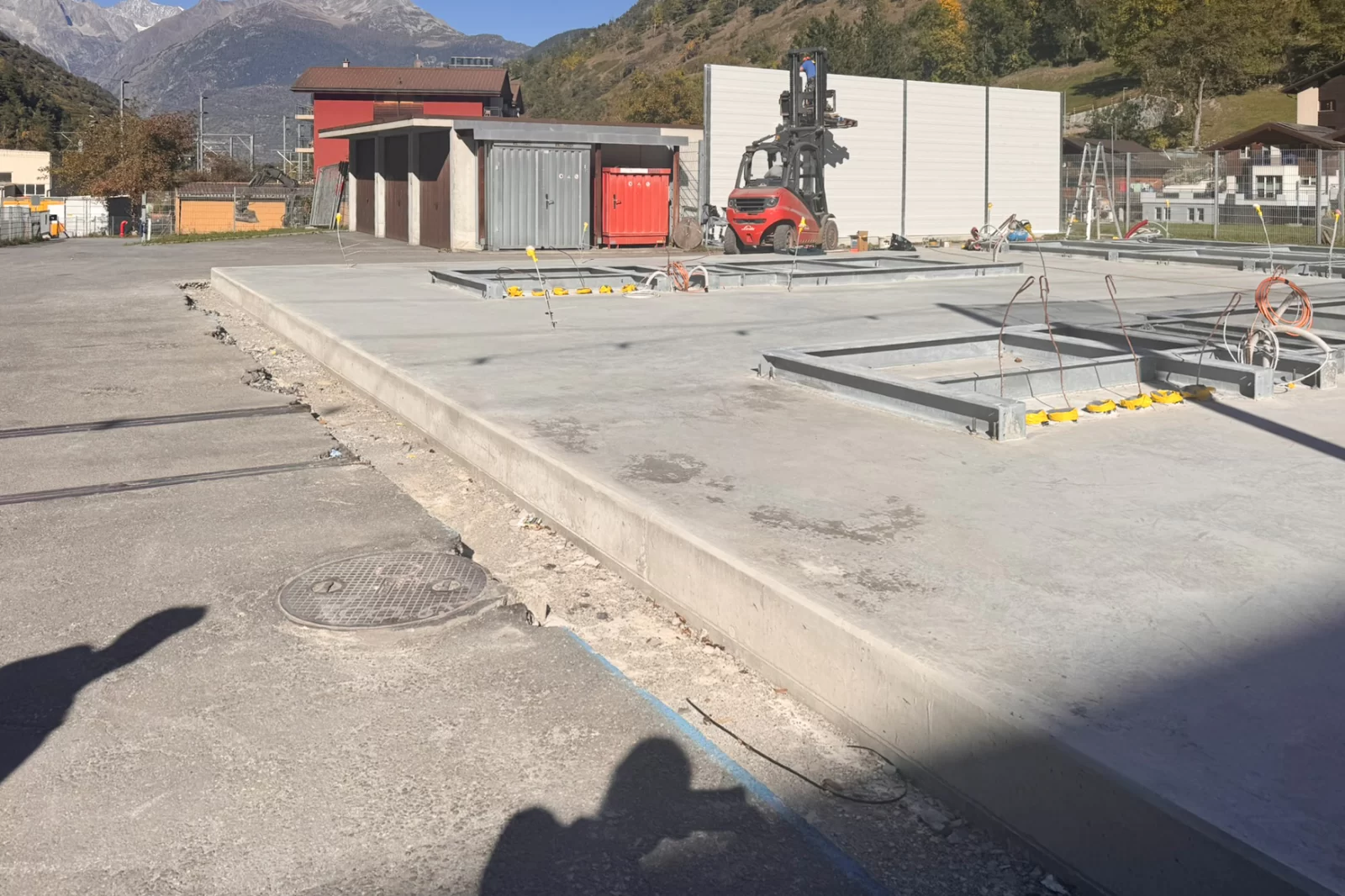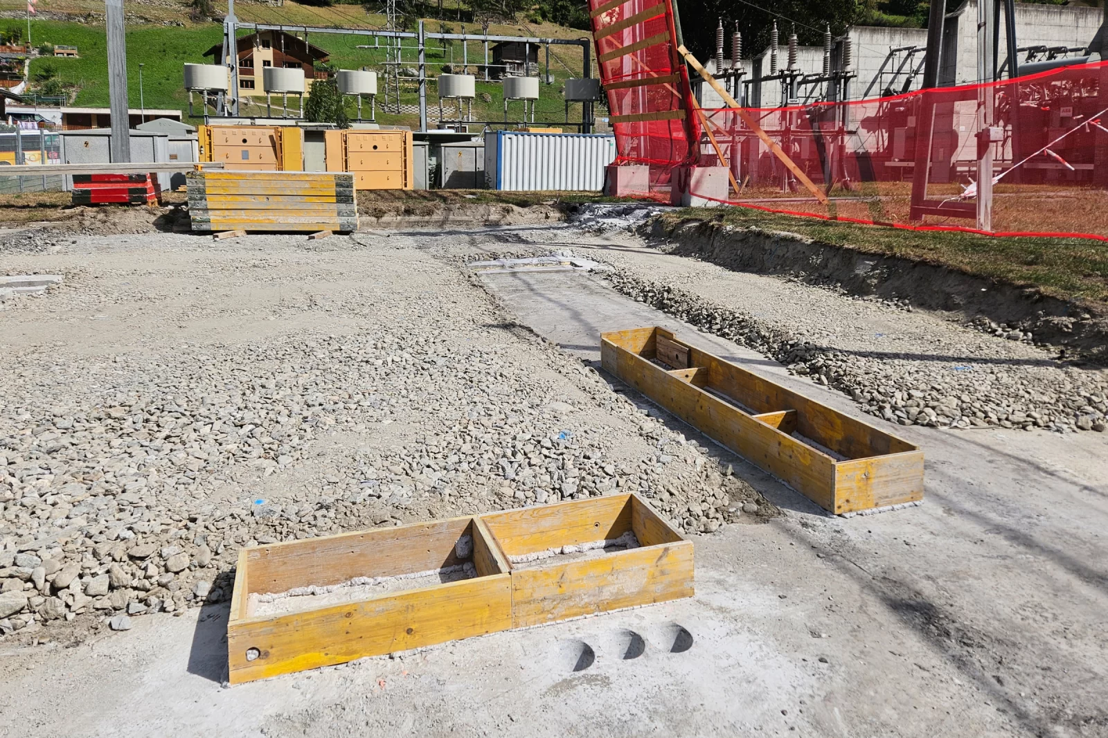 The base plate for the battery energy storage system was constructed at the Ackersand site in the municipality of Stalden. Once the earthworks and excavation work had been completed, the ground was prepared, leveled and compacted. Subsequently, base concrete was poured as a foundation for further work. The formwork was then erected and the reinforcement laid according to plan. The floor slab was constructed using in-situ concrete, whereby the concrete was poured, compacted and finished. Finally, the concrete was cured to create a load-bearing and durable floor slab for the operation of the battery energy storage system.