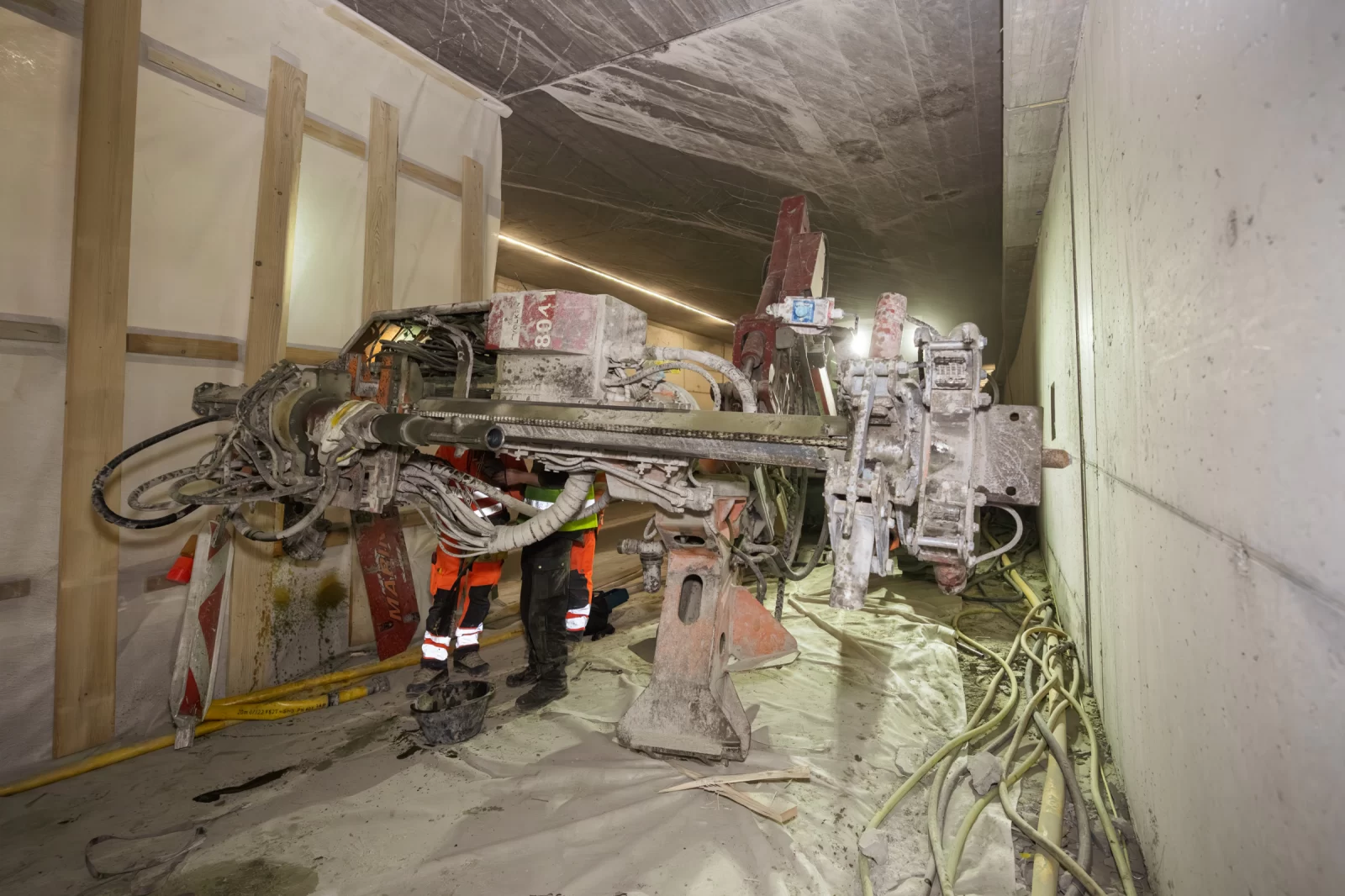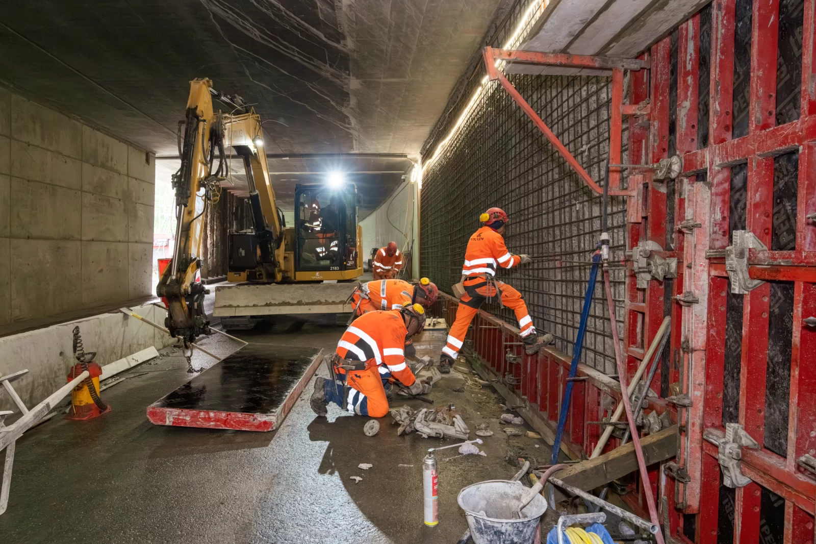 Nel cantiere dell'A9 EP ENGI - Galleria Engi, nell'ambito degli interventi immediati 2, si stanno realizzando nuove costruzioni e rinforzi mirati per garantire la capacità portante delle sezioni D ed E fino alla ristrutturazione a lungo termine. Ciò include l'installazione di nuovi componenti in calcestruzzo nel soffitto e negli elementi portanti della galleria, integrati da lavori di calcestruzzo proiettato nelle aree localmente danneggiate. Gli ancoraggi precompressi stabilizzano ulteriormente la costruzione. Saranno posati nuovi tubi di drenaggio per migliorare il drenaggio. Infine, la carreggiata viene sottoposta a un nuovo strato superficiale come strato protettivo per garantire la durata e la sicurezza della galleria durante l'esercizio.